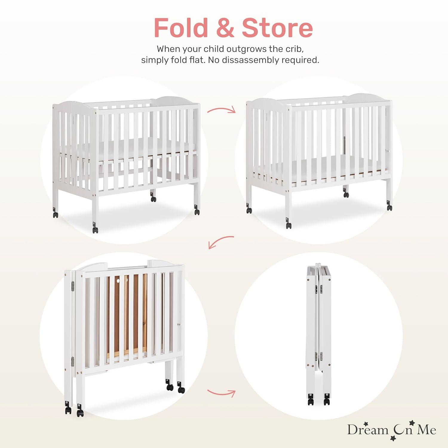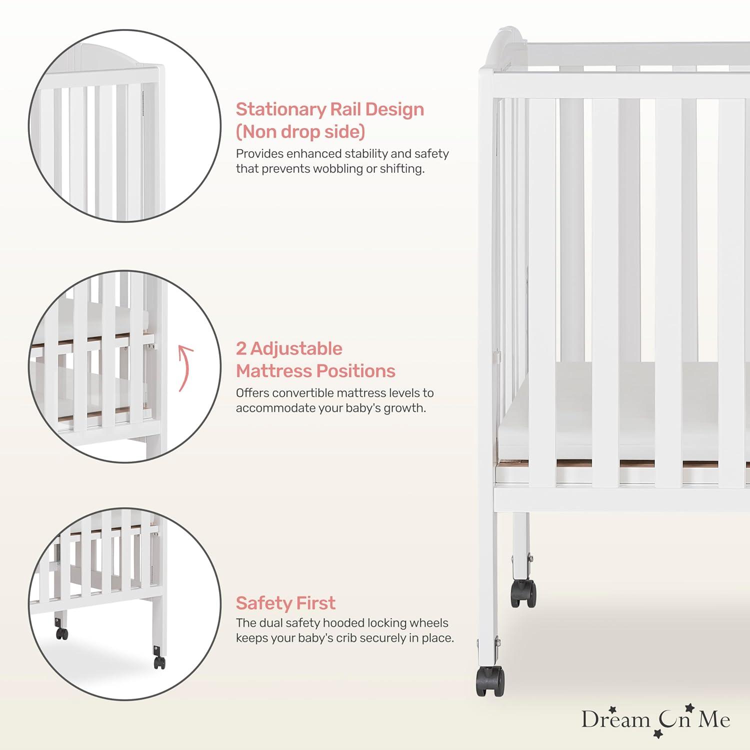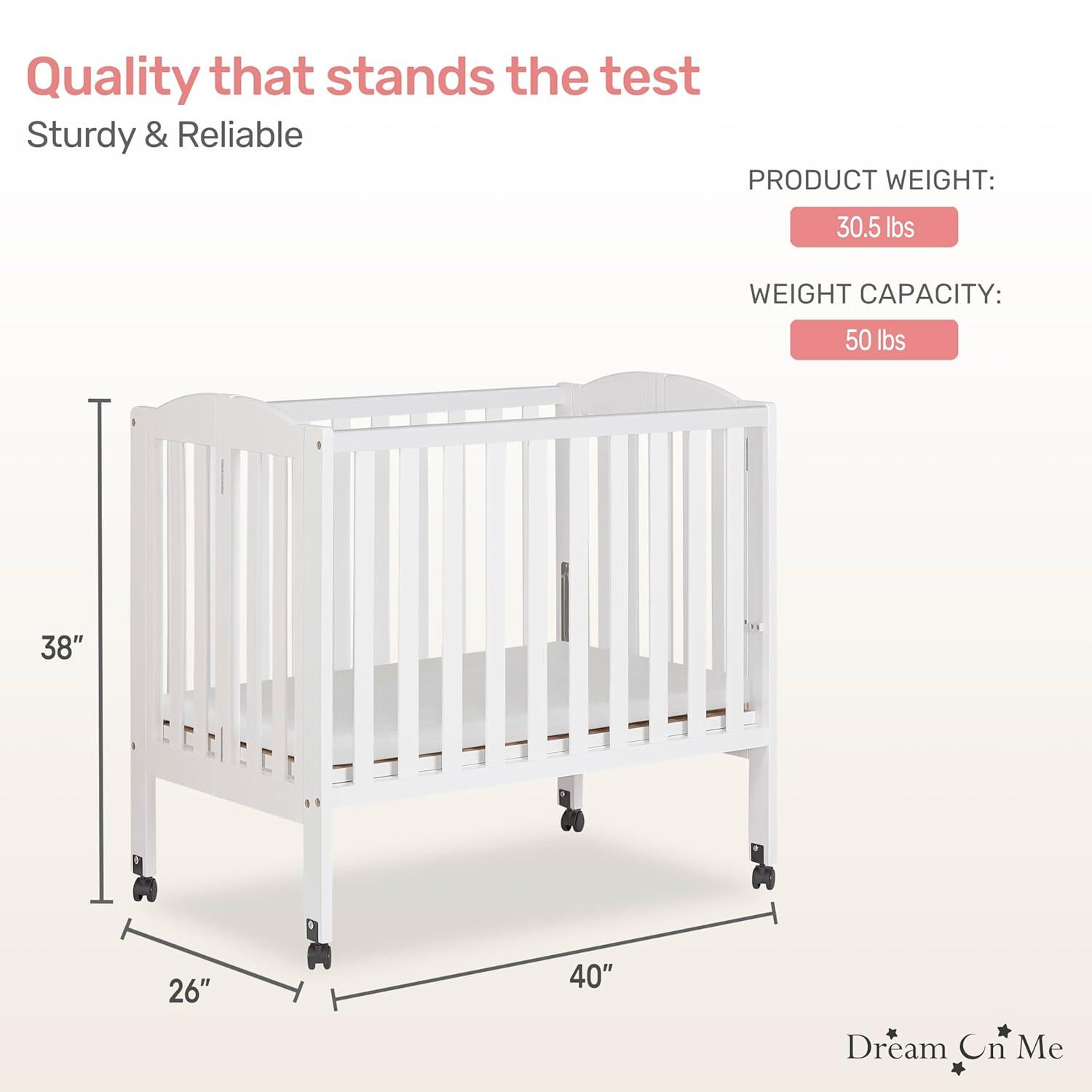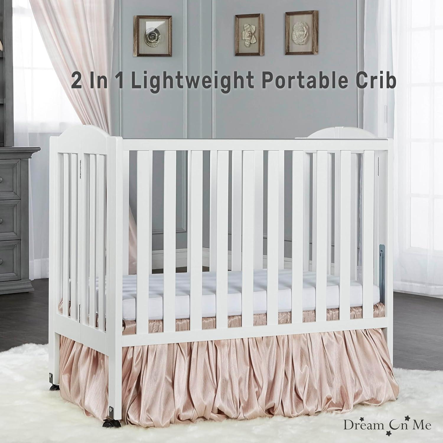 Sleek, compact, and thoughtfully designed, the Dream On Me 2-in-1 Portable Mini Crib brings modern style and practical convenience into any nursery or shared space. Its clean lines, smooth finish, and contemporary look ensure it blends seamlessly with a variety of décor styles, while its smaller footprint makes it the perfect choice for apartments, grandparents’ homes, or daycare centers. This versatile crib does more than just look good—it’s designed to adapt. The 2-in-1 functionality allows it to transition from a crib to a playpen, giving your little one a safe and reliable space to sleep or play. And when flexibility matters most, families can rely on our Patented Folding Mechanism (U.S. Patent #6817046 / #8479328 B2), which folds flat in seconds for stress-free storage and travel. Built from sustainable New Zealand pinewood, this mini crib combines natural strength with timeless appeal. It sits on **four smooth-rolling wheels—two locking and two non-locking—**so you can move it easily between rooms and lock it safely in place when needed. Parents can also feel confident knowing this crib is GREENGUARD Gold certified and meets ASTM and CPSC safety standards. It has been rigorously tested for over 10,000 chemical emissions and VOCs and finished with a non-toxic, lead- and phthalate-safe process—ensuring a healthy environment for your baby to sleep, play, and grow. Designed to grow with your child, the crib features two adjustable mattress height settings for newborn to infant stages. It also comes with a 1″ compliant mattress pad, giving your little one a cozy and secure sleep space from the start. Measuring 40″ L × 26″ W × 38″ H, the crib offers comfort in a compact size, making it an ideal solution for smaller living spaces without sacrificing safety or convenience. The Dream On Me 2-in-1 Portable Mini Crib is where design meets practicality—beautifully styled, safety-certified, and crafted to give families portability, durability, and peace of mind.