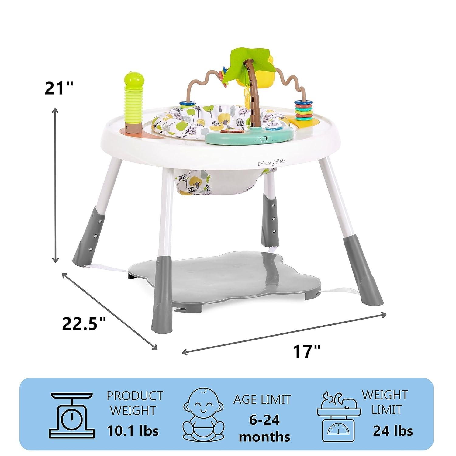 Say hello to the Dream On Me Curio Sit N Seek Baby Activity Center – the perfect choice for Busy Parents and Active Babies! With a 2-in-1 design that grows with baby from an Activity Center to a Play Table, 3 height level adjustable positions and 360 degree rotatable seat, there is fun in all directions & easy access to all the toys and activities. The Dream On Me Curio Sit N Seek Activity Center for baby comes with 3 fun, detachable toys and in-built music. Made with a soft & comfortable fabric and a lightweight & sturdy base, the Dream On Me Curio Sit N Seek Activity Center is a must-have. It comes in 3 curious finishes – Grey, Mint, and Lime. Product dimensions are 17” L X 22.5” W X 21” H, with a weight of 10.1 Lbs. This activity center for baby has a maximum weight capacity of 24 Lbs and is suitable for children between 6-24 months.