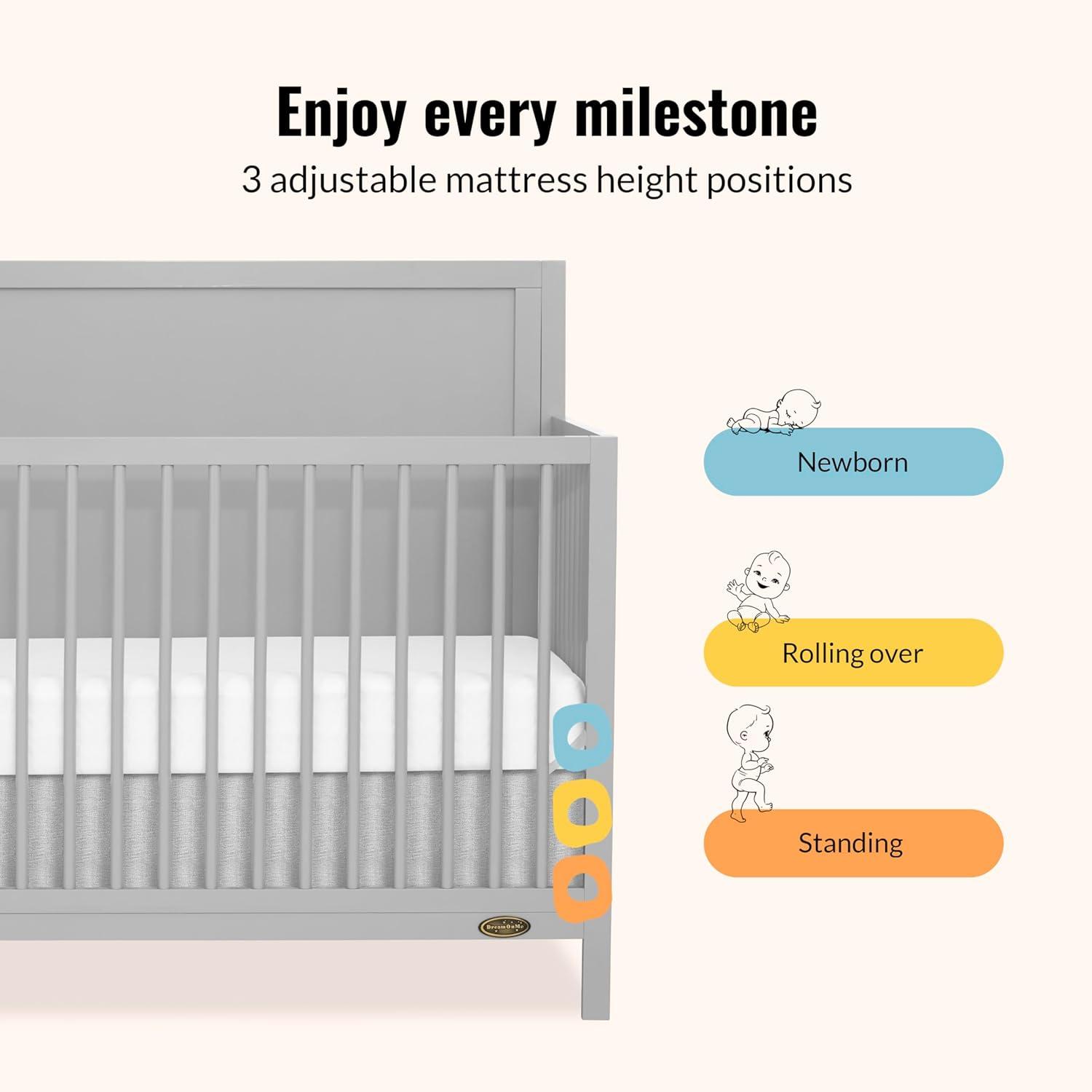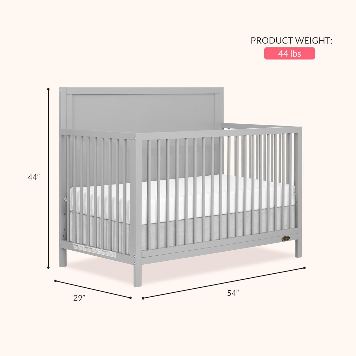 Introducing the Dream On Me Dillian 5-in-1 Convertible Crib, that seamlessly combines safety, durability, and style, making it the perfect addition to your nursery. This thoughtfully designed crib grows with your child, adapting to their changing needs, transforming from crib to a toddler bed & full-size bed (Conversion Kit sold separately). Our Dillian 5-in-1 Convertible Crib meets the highest safety standards, including ASTM & CPSC and is also JPMA & Greenguard Gold certified, for your baby's well-being. Crafted from durable New Zealand Pine Wood with wooden spindles, this must-have crib is both elegant and robust, ensuring safety & stability What’s more, you can keep the Dream On Me Dillian 5-in-1 Convertible Crib looking pristine with minimal effort – simply spot or wipe clean! Choose between classic White or trendy Pebble Grey to perfectly complement your nursery's aesthetic. Product dimensions are 54.09″ L X 29.25″ W X 43.82” H, with a weight of 44 Lbs. This crib is designed for little ones aged 0 to 5 years.