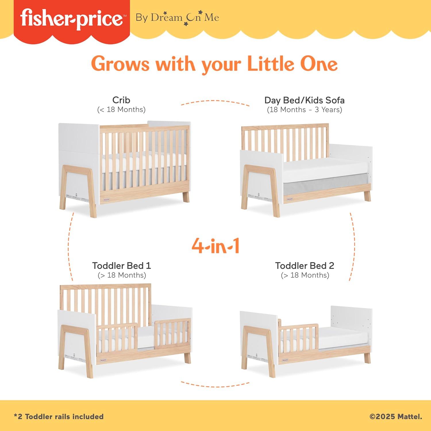Ever-Evolving: This Fisher Price Iris crib transforms into a daybed, toddler bed (with 2 guard rails included), and toddler bed (with 4 guard rails), adapting to your child’s growing needs. The toddler bed with 4 guard rails requires an additional 2 guard rails, sold separately. From crib to daybed to toddler bed, this piece evolves alongside your little one's milestones, offering endless possibilities for comfort and safety.