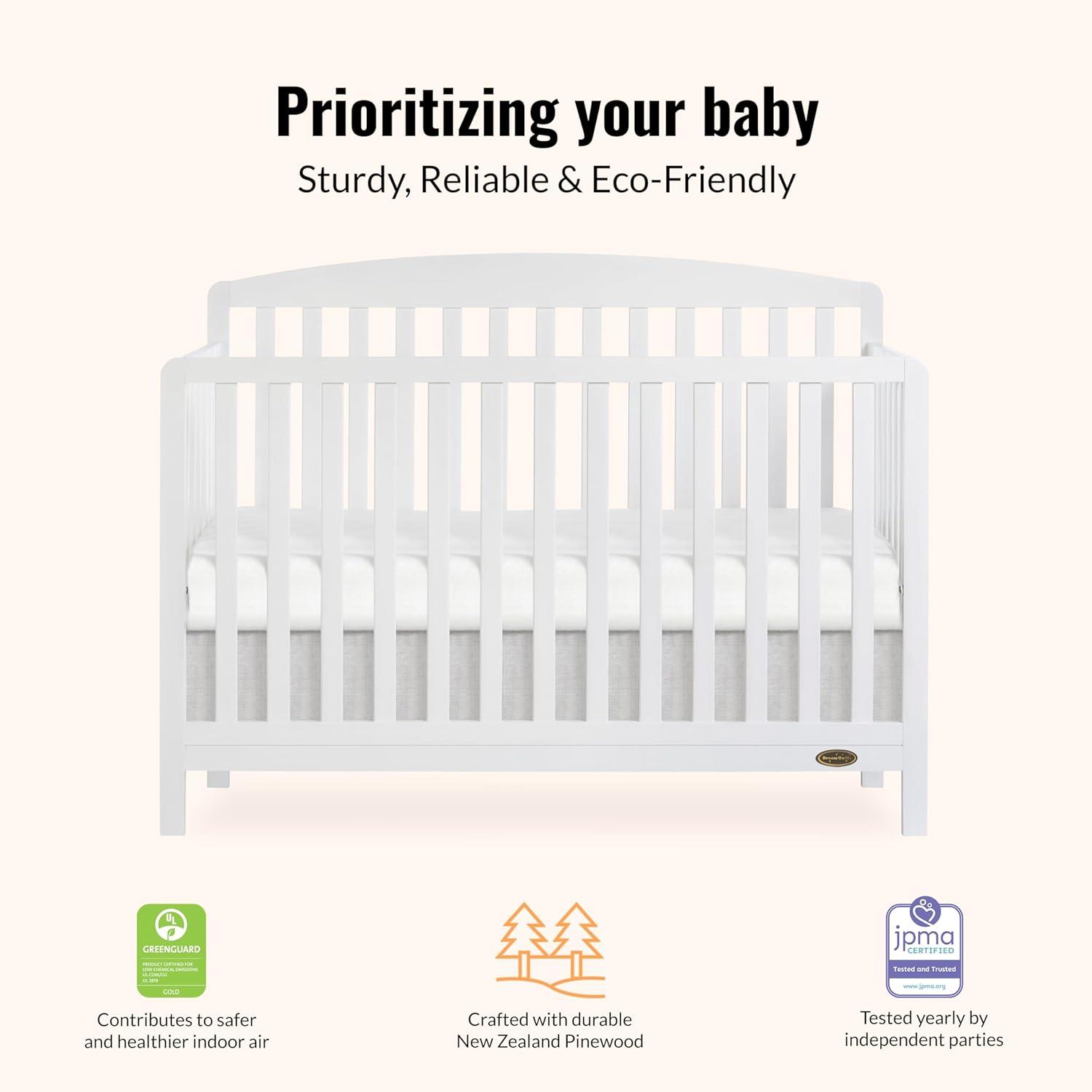The Odelle 5-in-1 Convertible Crib is designed to grow alongside your child, offering a practical and stylish solution for every stage of early life. Starting as a cozy baby crib (mattress sold separately), it easily converts into a toddler bed, daybed, and even a full-size bed with or without a footboard (conversion kits sold separately). This versatile design provides long-term value, adapting seamlessly to your child’s needs from infancy through childhood while maintaining a timeless look that fits any nursery. Comfort and convenience are at the heart of the Odelle crib. With three adjustable mattress height options, it ensures that parents can easily reach newborns while keeping active toddlers safe and secure. The thoughtful design grows with your child, offering a comfortable sleep environment that evolves with their development. Built to last, the Odelle crib features high-quality craftsmanship using sustainably sourced New Zealand pinewood and a heavy-duty metal mattress support frame for exceptional strength and stability. Packaging is tested to minimize the risk of damage during transit, and assembly is straightforward, giving you a durable crib you can trust for years to come. Safety is paramount, and the Odelle crib exceeds expectations. Expertly designed to meet or surpass ASTM and CPSC safety standards, it is also GREENGUARD Gold Certified, screened for over 10,000 chemicals and VOCs to ensure cleaner indoor air for your baby. Independently tested and CPSIA compliant, it maintains lead and phthalate levels well below federal limits, offering a secure and healthy sleep environment. Everyday convenience is built into the design with smooth edges, sturdy construction, and practical features that make the crib easy to use daily. Its versatile style fits seamlessly into bedrooms, nurseries, or shared spaces, blending functionality with aesthetic appeal for modern family life. Measuring 54.72” L x 29.33” W x 40.16” H and supporting a weight limit of 50 lbs, the Odelle crib is backed by a 1-year limited manufacturer’s warranty. For optimal safety and comfort, pair it with a Dream On Me or evolur full-size GREENGUARD Gold Certified mattress. With the Odelle 5-in-1 Convertible Crib, you’re choosing a long-lasting, adaptable, and safe space where your child can sleep, grow, and thrive.