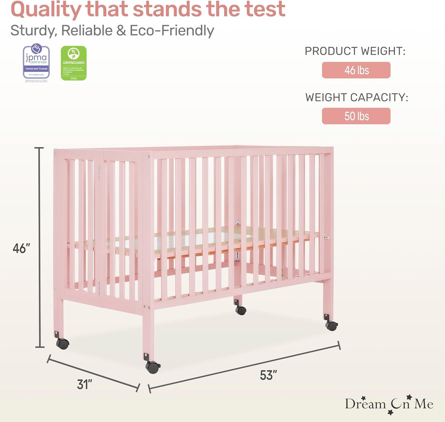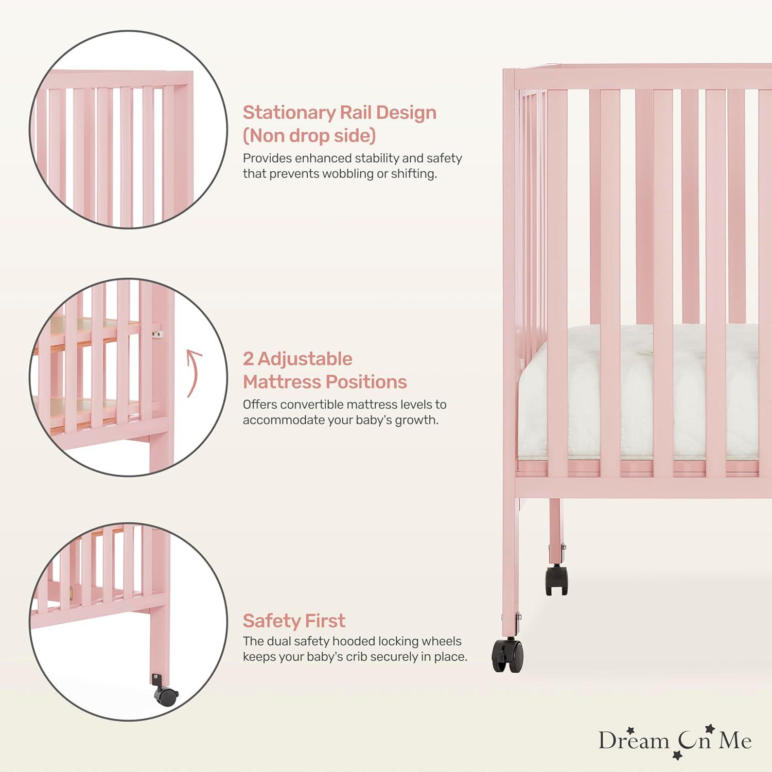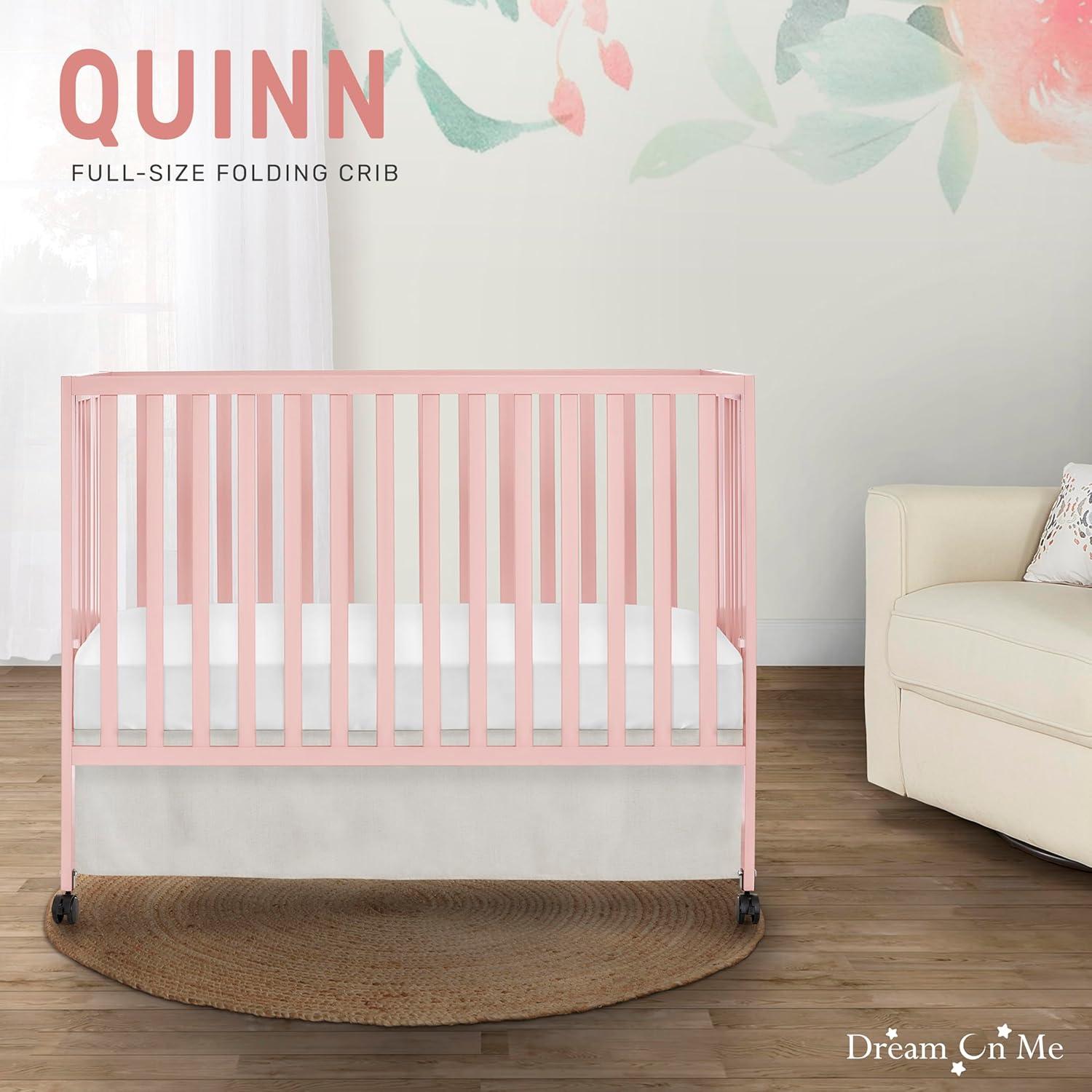 Dream On Me Quinn Full-Size Portable Baby Crib in White, GreenGuard Gold & JPMA, Patented Quick Fold System, Adjustable Mattress Support, Smooth Wheels, Compact Design, Safe Sleep Assurance(Pink)