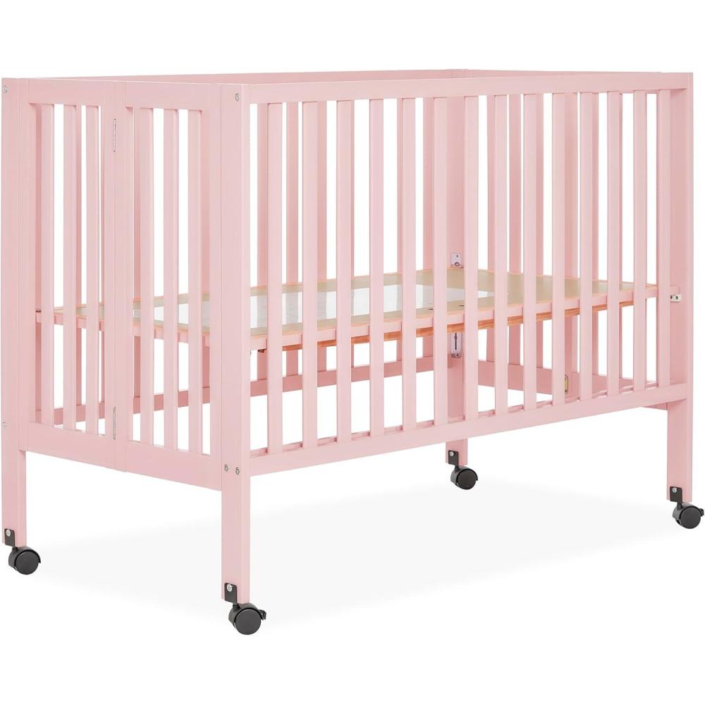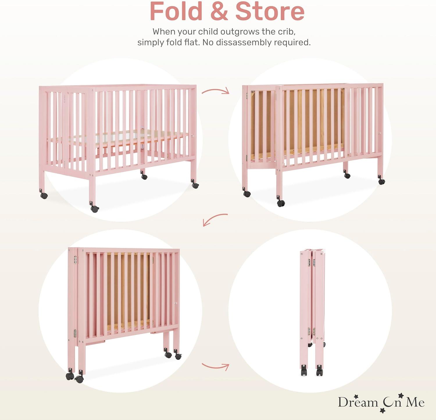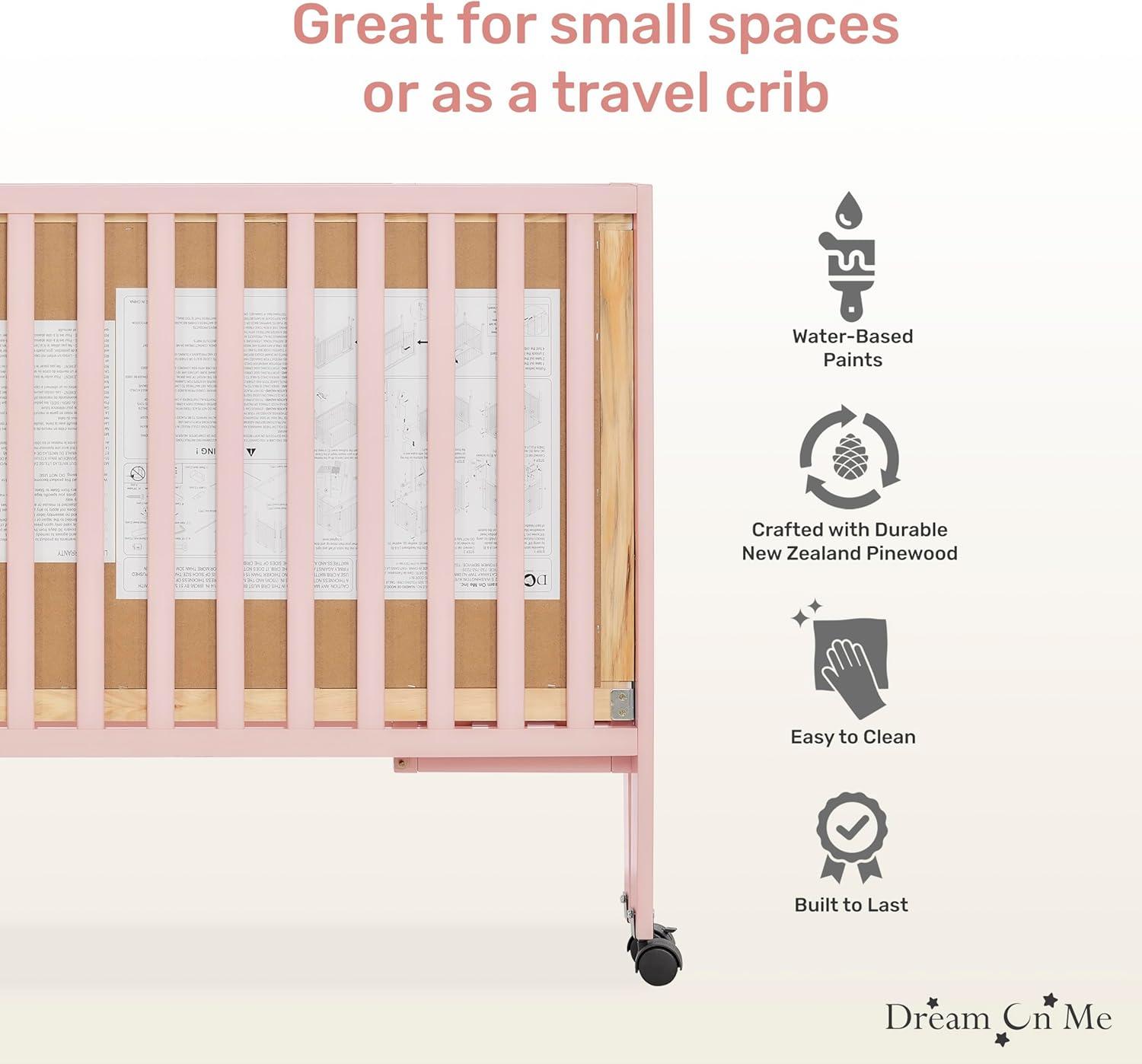 Dream On Me Quinn Full-Size Portable Baby Crib in White, GreenGuard Gold & JPMA, Patented Quick Fold System, Adjustable Mattress Support, Smooth Wheels, Compact Design, Safe Sleep Assurance(Pink)